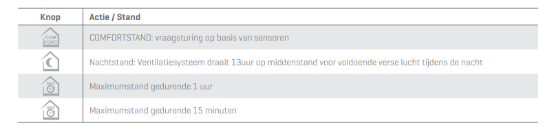 Die drahtlose Steuerung passt zu dem Oxygreen Light der Marke Renson. Die Fernbedienung kann vollständig drahtlos genutzt werden und hat 4 Knöpfe. Die 4 Knöpfe sind verschiedene Optionen, bei denen der Wohnhausventilator Oxygreen Light entsprechend läuft. Damit können Sie die Box für einen temporären Maximalbetrieb, eine Nacht-Funktion oder einen Komfort-Betrieb einstellen, bei dem die bedarfsorientierte Belüftung genutzt wird.